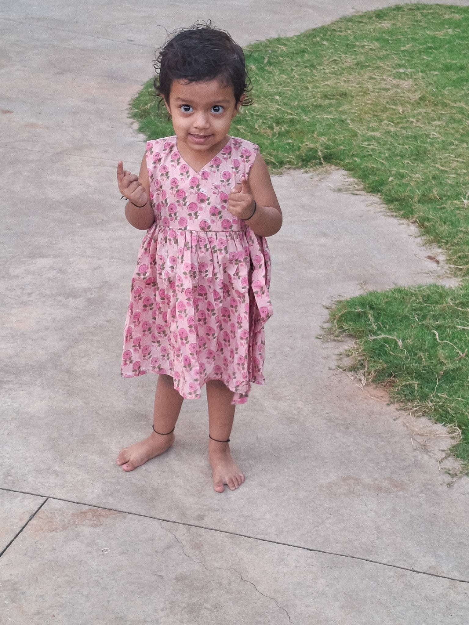 Made from breathable, baby-friendly mul mul cotton, this frock features a graceful overlapping angarkha-style bodice inspired by traditional Indian silhouettes.