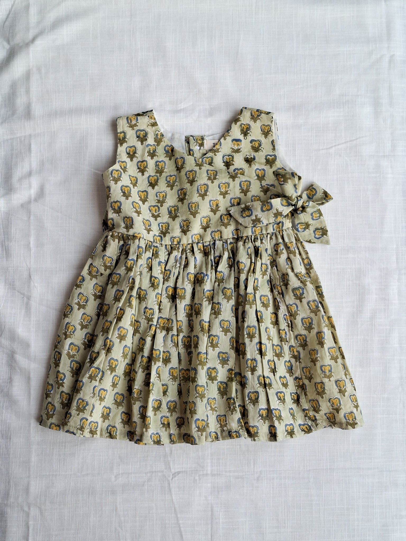 Siya Little Olive Handblock Print Angarkha With Side Bow Mul Mul Cotton Frock